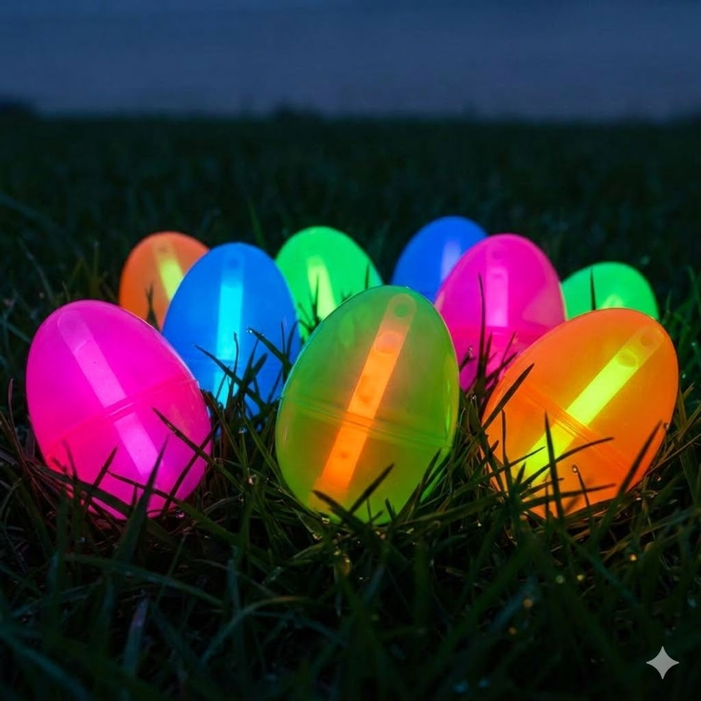 - Snap & Hide — Crack open each egg, drop in a glow stick (takes seconds), snap shut, and scatter them around your yard or home at dusk.